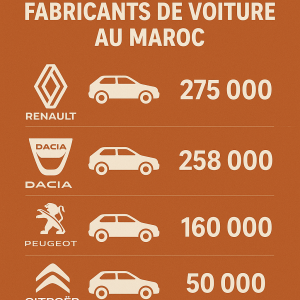 Catégorie Modèles & Usines Sous-compactes Dacia Sandero, Logan, Sandero (Renault) Monospaces Lodgy, Dokker (Tanger) Citadines / EV Peugeot 208, Citroën Ami, Opel Rocks EV, Fiat Topolino (Kénitra) Utilitaires Kangoo (Somaca) Premium & EV BYD (Tangier), SUV NEO (locaux) Exportations & destinations